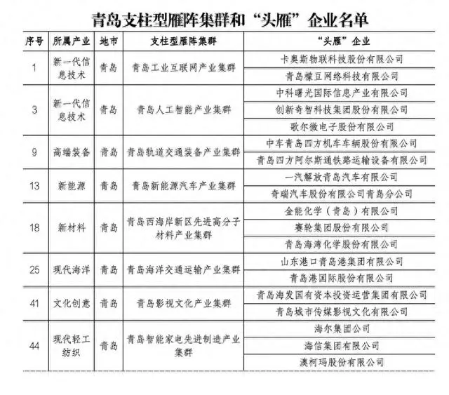 山东省绿色低碳高质量发展先行区建设领导小组办公室日前发布通知,确定了45个支柱型雁阵集群和96家“头雁”企业。其中,青岛共有青岛工业互联网产业集群等8个集群、卡奥斯物联科技股份有限公司等19家企业入选,入选数量领跑全省。