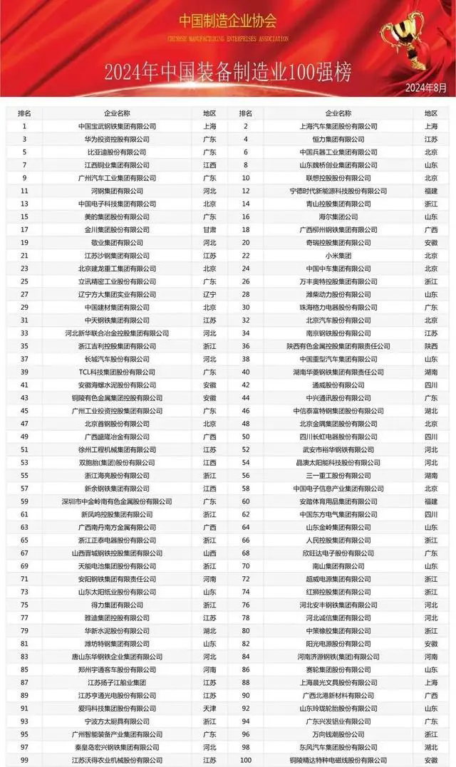 入围2024中国装备制造业百强的山东企业共10家,分别是:山东魏桥创业集团有限公司、海尔集团公司、潍柴动力股份有限公司、中国重型汽车集团有限公司、山东金岭集团有限公司、南山集团有限公司、山东太阳纸业股份有限公司、潍坊特钢集团有限公司、赛轮集团股份有限公司、山东玲珑轮胎股份有限公司。