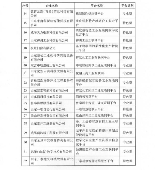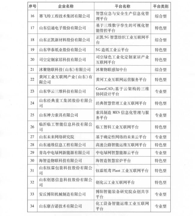 为深入贯彻落实《山东省制造业数字化转型行动方案(2022-2025年)》等文件精神,根据《山东省工业互联网平台培优工作方案》部署要求,省工业和信息化厅组织开展了2023年省级工业互联网平台入库遴选工作,经企业申报、各市推荐、现场核查、专家评审、项目公示等程序,确定了2023年省级工业互联网平台名单,现予以公布(名单见附件)。