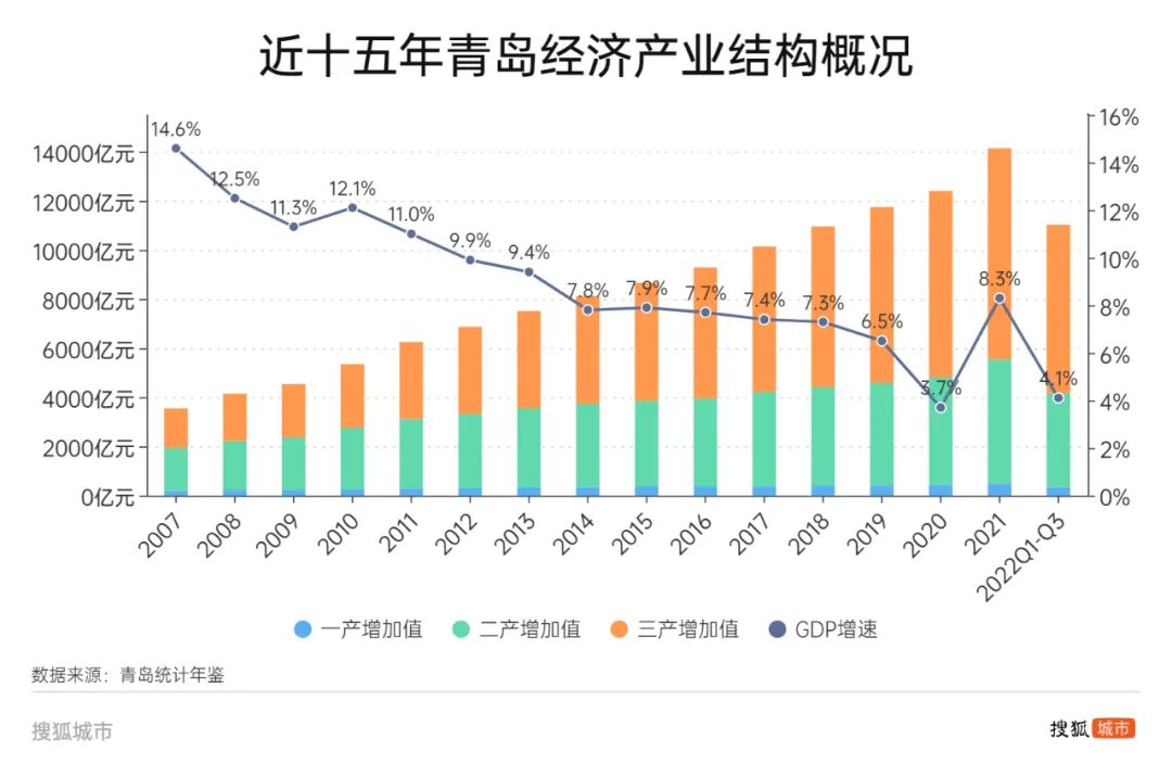 2007年,山东省服务业发展工作会议提出“青岛要率先形成以服务经济为主的产业结构”的要求。按此要求,青岛要力争到“十二五”中期,服务业增加值占全市GDP比重达到50%以上。此后,青岛服务业占比几乎以每年1个百分点左右速度蹿升,与此同时,青岛工业占比也以每年1个百分点左右速度下滑。