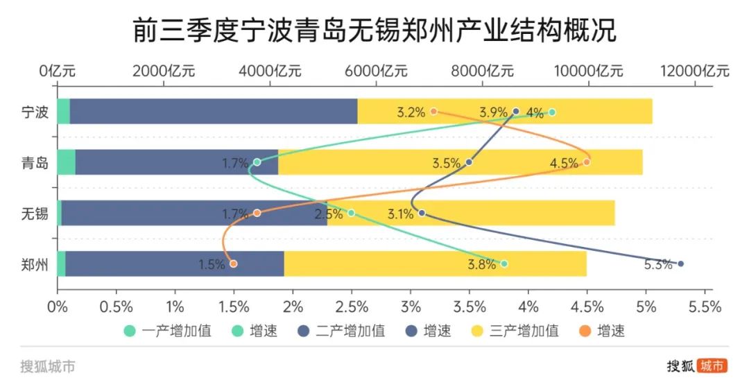 今年前三季度,青岛经济总量与宁波拉近,只相差183亿元;拉大与无锡的距离,高于无锡523.8亿元;继续扩大对郑州优势,高于郑州1055.6亿元,巩固“北方第三城”的位置。但是,青岛二产增加值为3821亿元,比宁波少约1595亿元,相比无锡少约1187亿元,比郑州少约300亿元。前三季度青岛二三产占比34.7:62.2,二产相比去年整年又回落1.2个百分点。